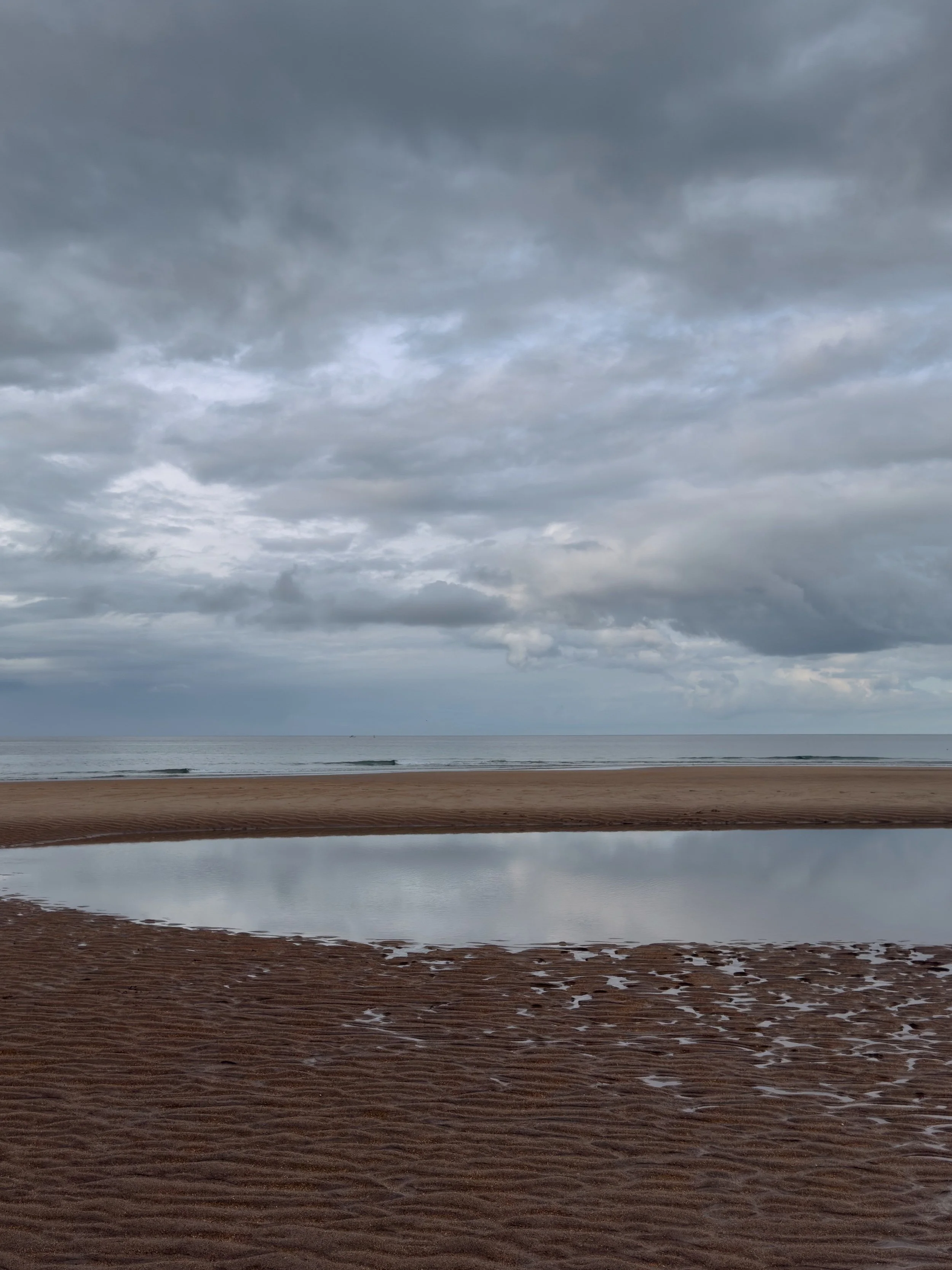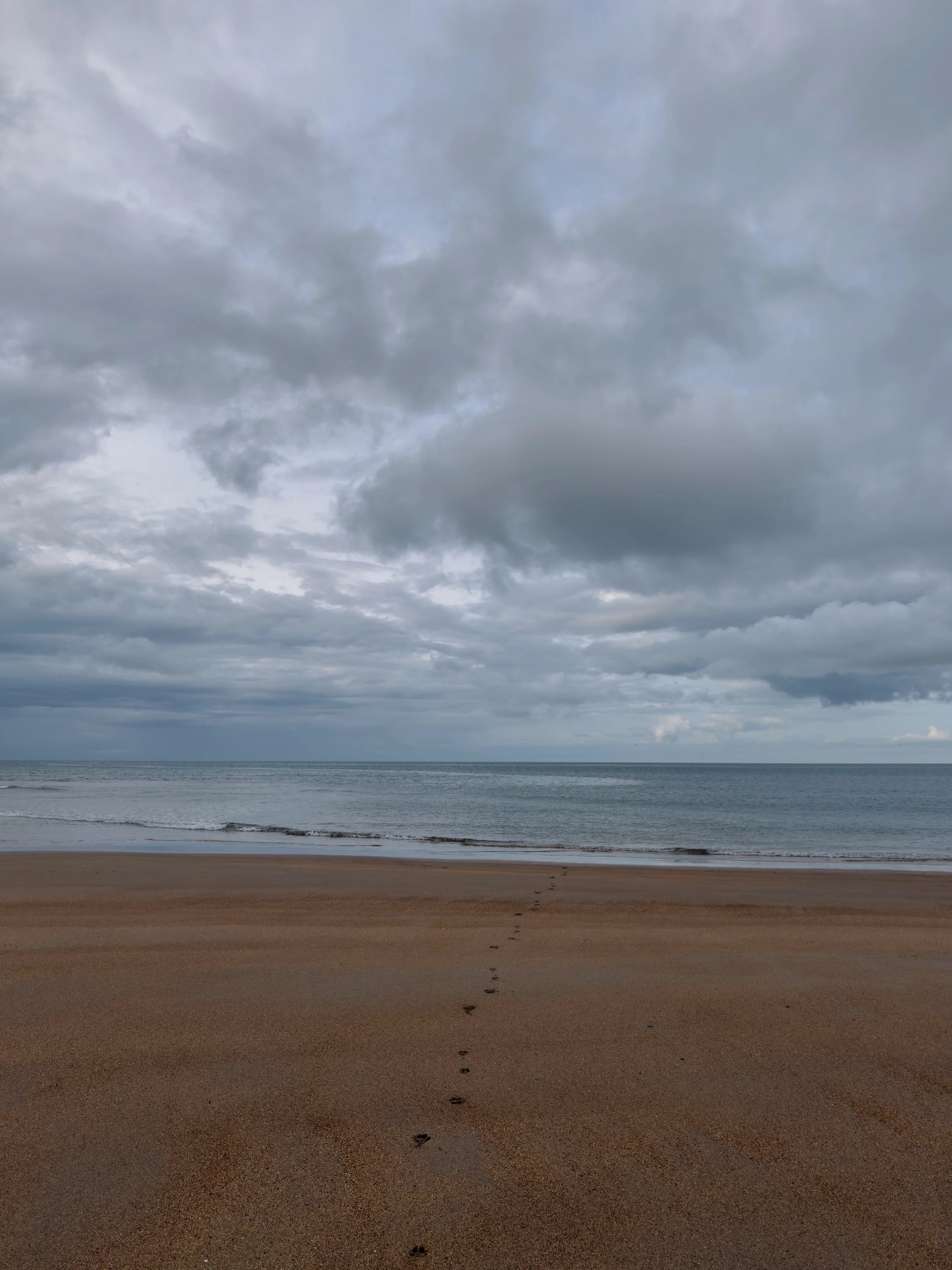 This walk is from early June, and an evening when we were trying our best to avoid people. We’d arrived at John Muir Country Park and there must have been people around, perhaps some kids setting out to camp. I can’t remember now, but we walked across the salt marshes instead, away from the woods, and arrived on the beach to these wide, expansive views at low tide. It was an evening where the light had been dimmed, low clouds offering a palette of muted blues and grey tones in the sky, and in the cloud reflections hanging in the pools of water left behind by the receding tide. An unshowy sky, but I was enjoying these layers, and while you can’t see him, Raf was enjoying running free across the sand, splashing along the shore, completely at home here, in this place.