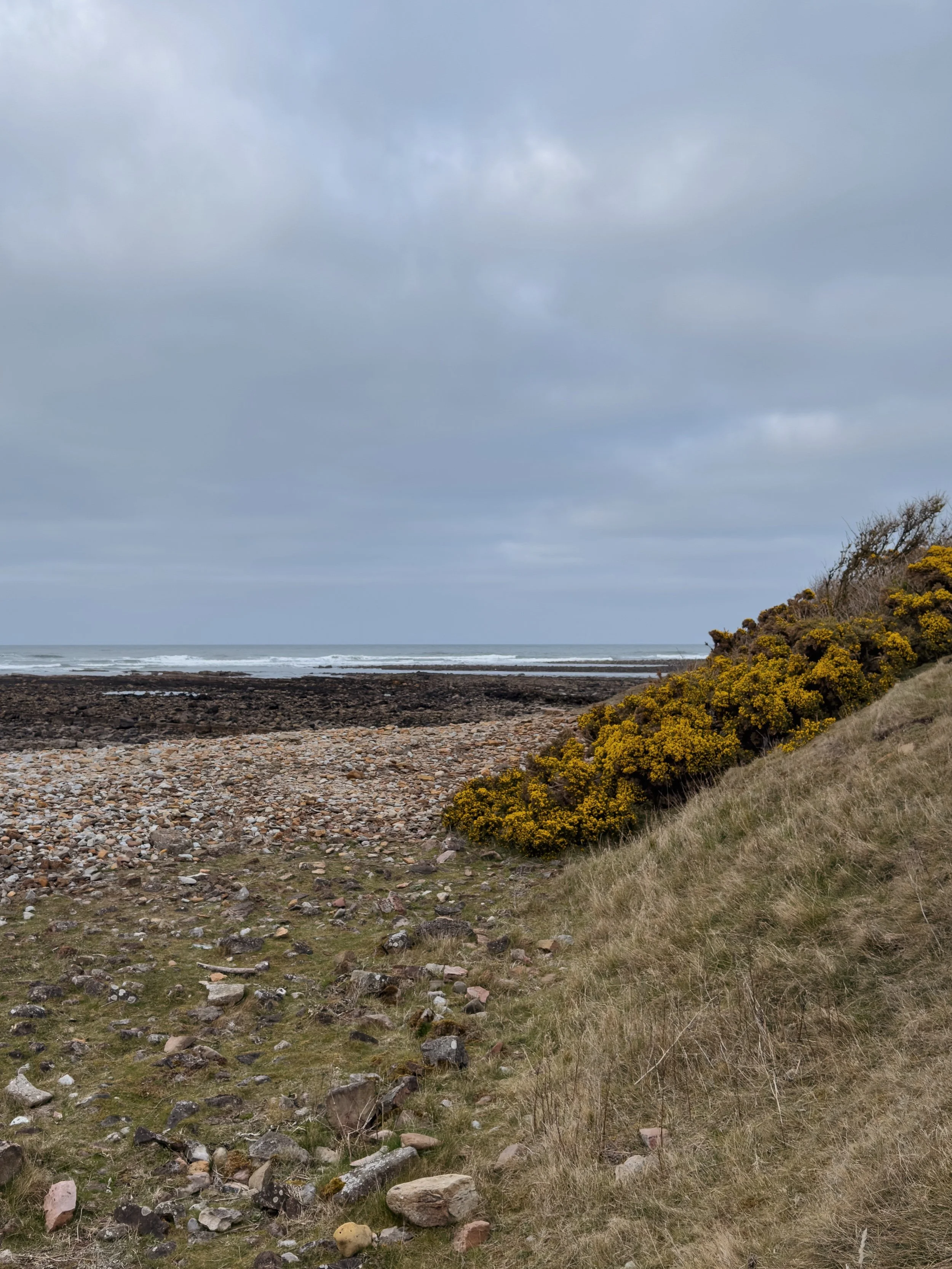 So let’s rewind to this gloomy-skied walk at Barns Ness and on towards Torness. The remarkable thing when I look at this, revisiting these photos from April 5th, is how these weeks have passed. I remember standing above the shore and appreciating the visual impact of the vibrant golden gorse within this grey and green and brown-toned coastal palette. That coconut-y gorse held the promise of those warmer and brighter days ahead. Walking here again on Saturday, this gorse has faded back, the brilliance of its colour now muted, flowers shrivelled against their stalks, as we’ve travelled through spring and find ourselves in the early days of summer.