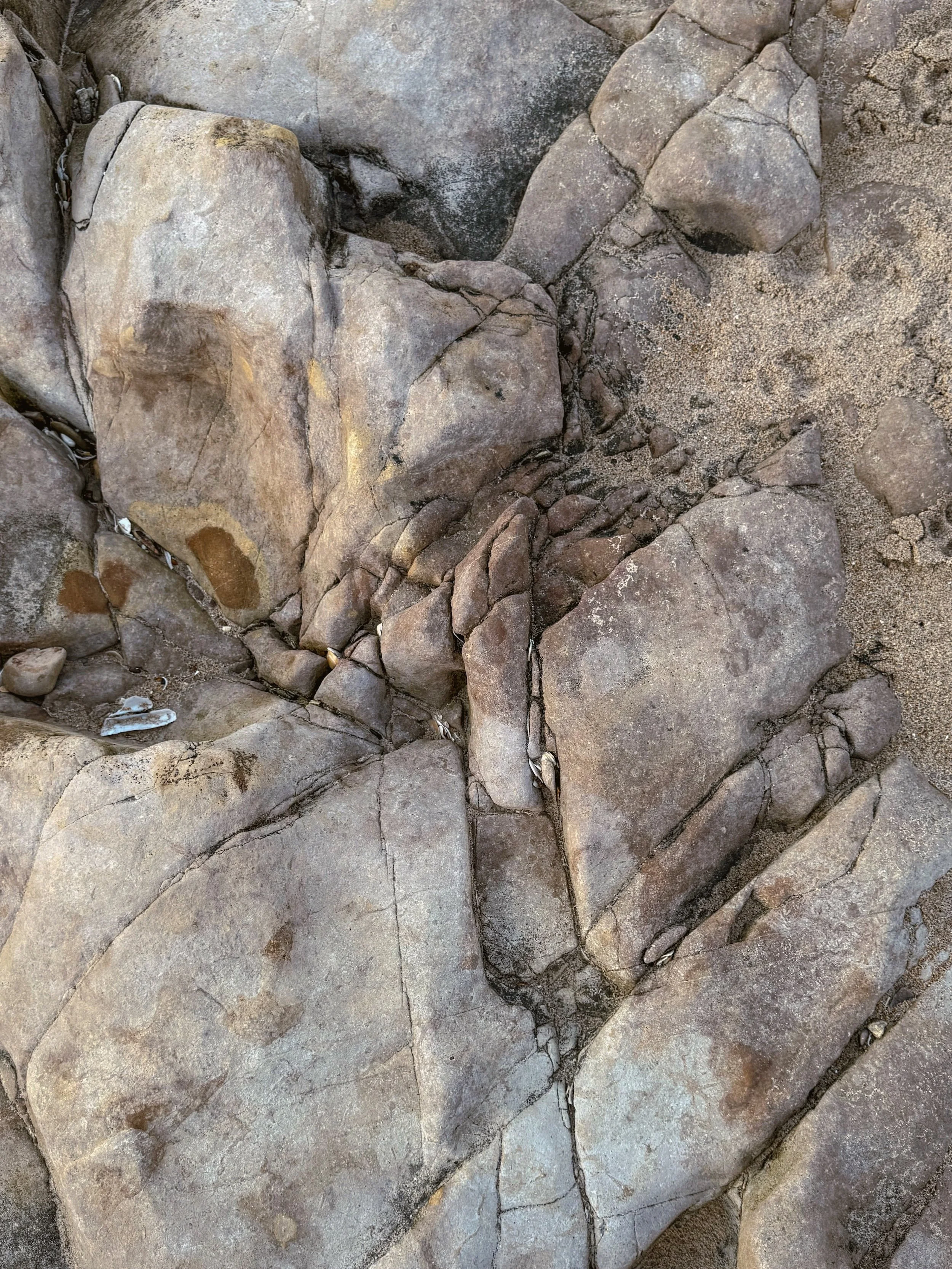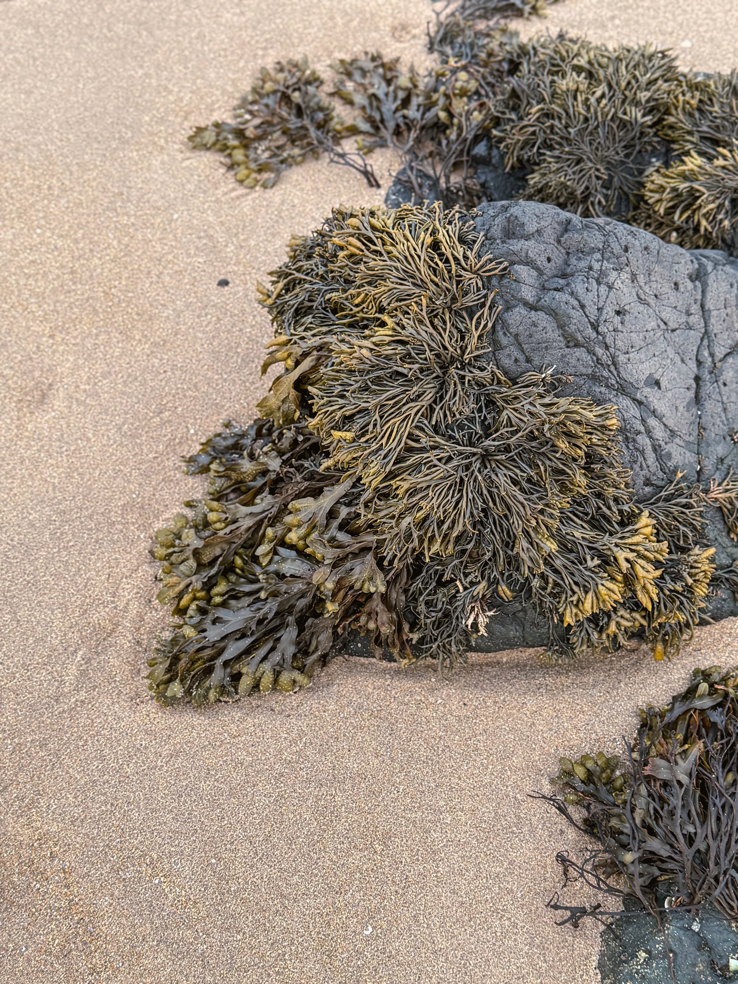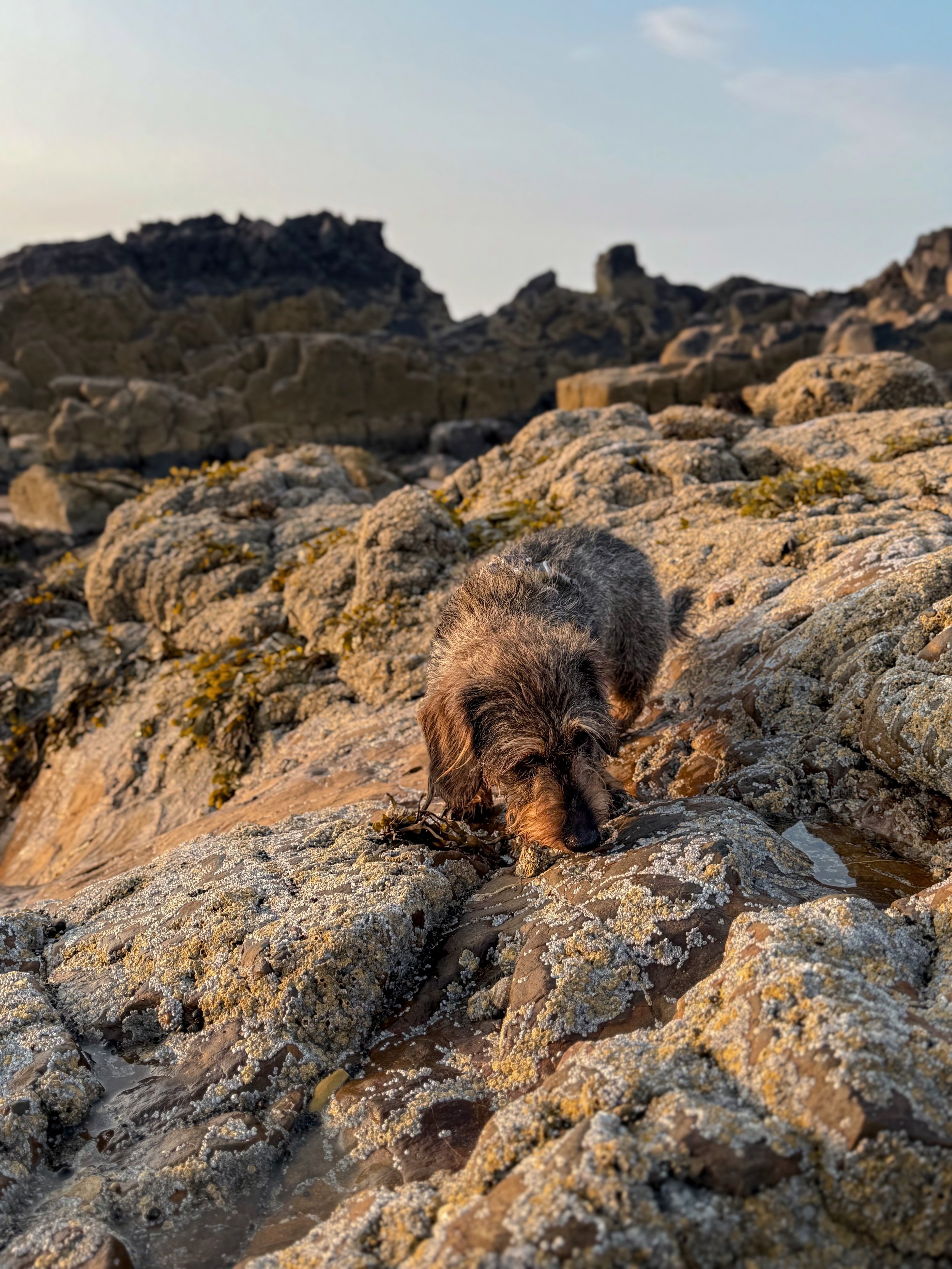 This was a beautiful low tide walk where we could move from beach to beach as the sea level was beyond the rocks, so we didn’t have to keep looping back up towards the dunes. As you can see, Raf had zero intention of standing still or posing for photos - there was too much to sniff and explore, and so much running to do. On the way back, we paused at this rock formation below. There’s a rock here that’s a familiar spot for us as I photographed Harris here quite a few times - including in October 2023, on the day before we knew how ill he was.