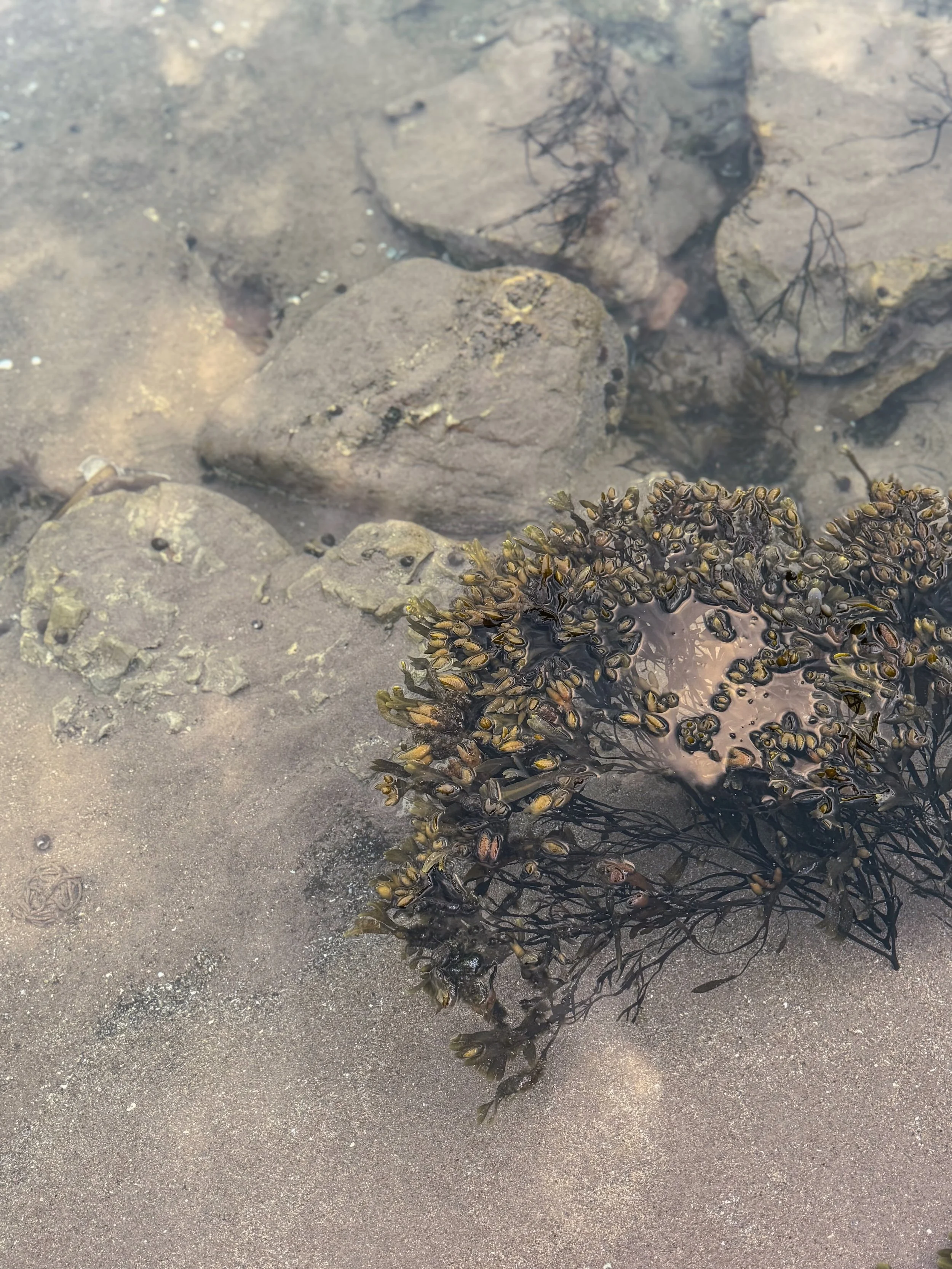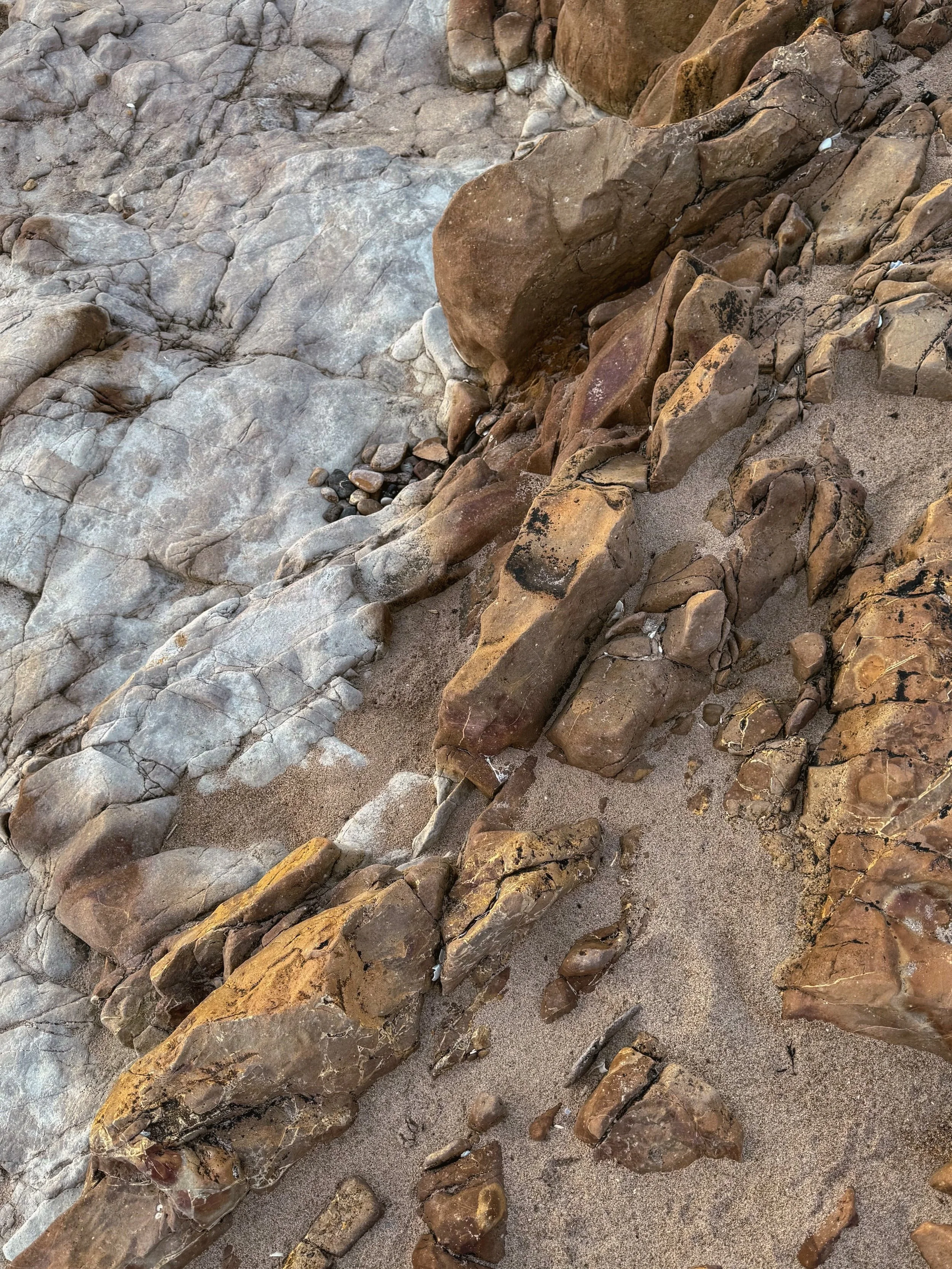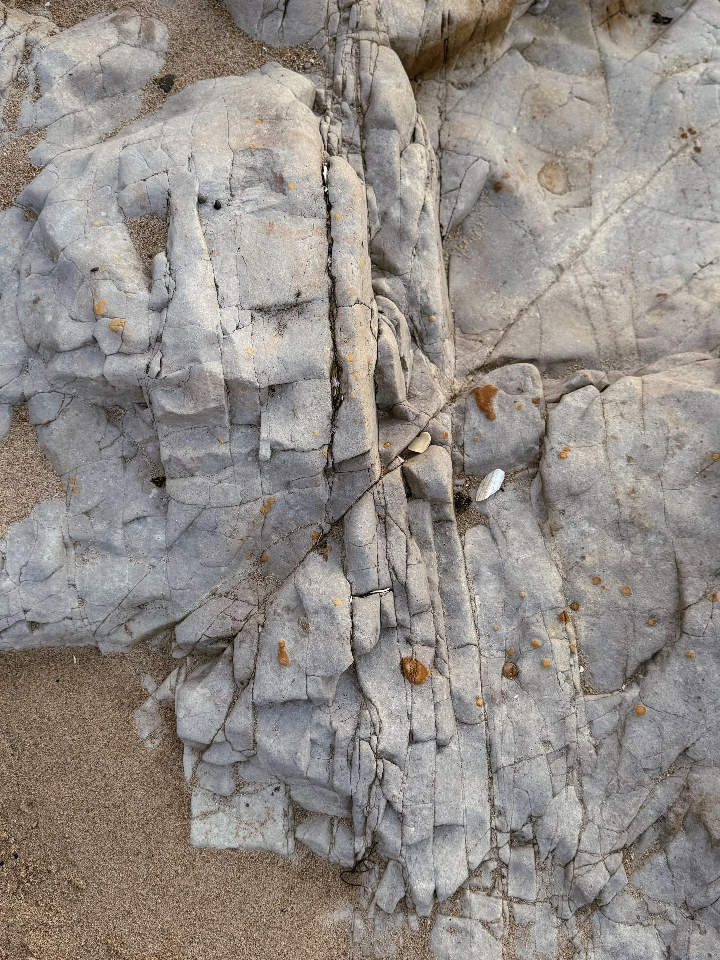This was a beautiful low tide walk where we could move from beach to beach as the sea level was beyond the rocks, so we didn’t have to keep looping back up towards the dunes. As you can see, Raf had zero intention of standing still or posing for photos - there was too much to sniff and explore, and so much running to do. On the way back, we paused at this rock formation below. There’s a rock here that’s a familiar spot for us as I photographed Harris here quite a few times - including in October 2023, on the day before we knew how ill he was.