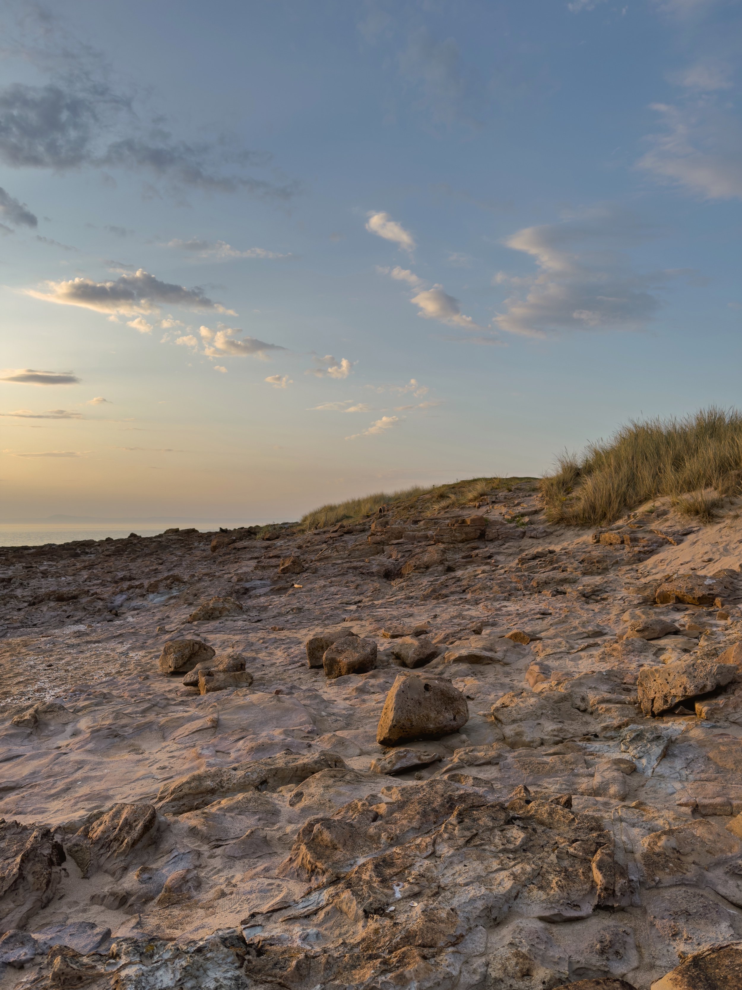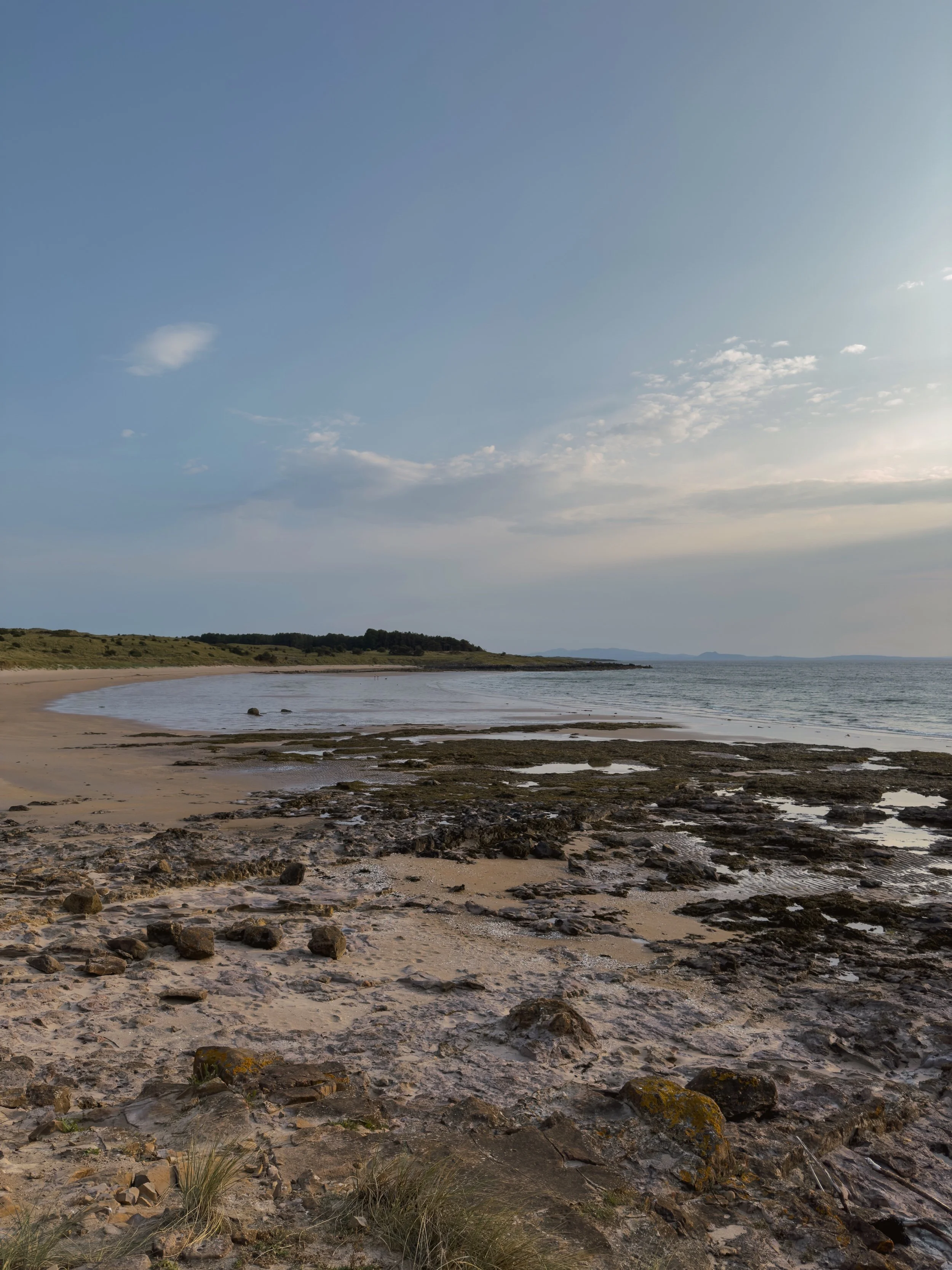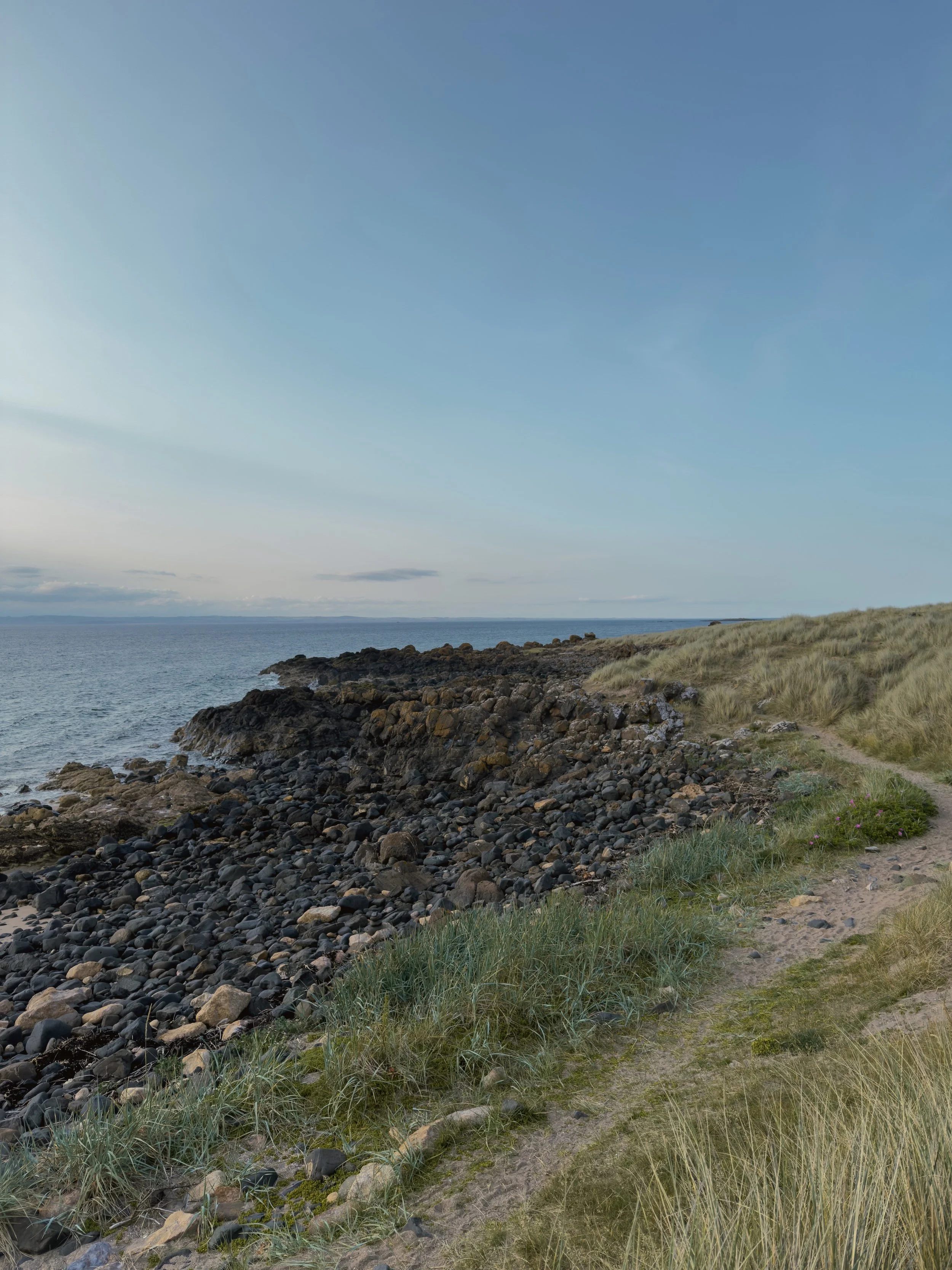 These following photos are from the same route but a week later, on a balmy Saturday evening when we marked the summer equinox with this walk. The light was gorgeous by the time we arrived here (below), to this stretch of beach beyond Gullane, and we walked on along the shore (cue: lots of rock photos in this gentle light) to our usual turning point, where we paused to watch the sun fade over the water. A gentle, unshowy sunset for this longest day of the year, and a moment that feels so far away now, as we edge into November.