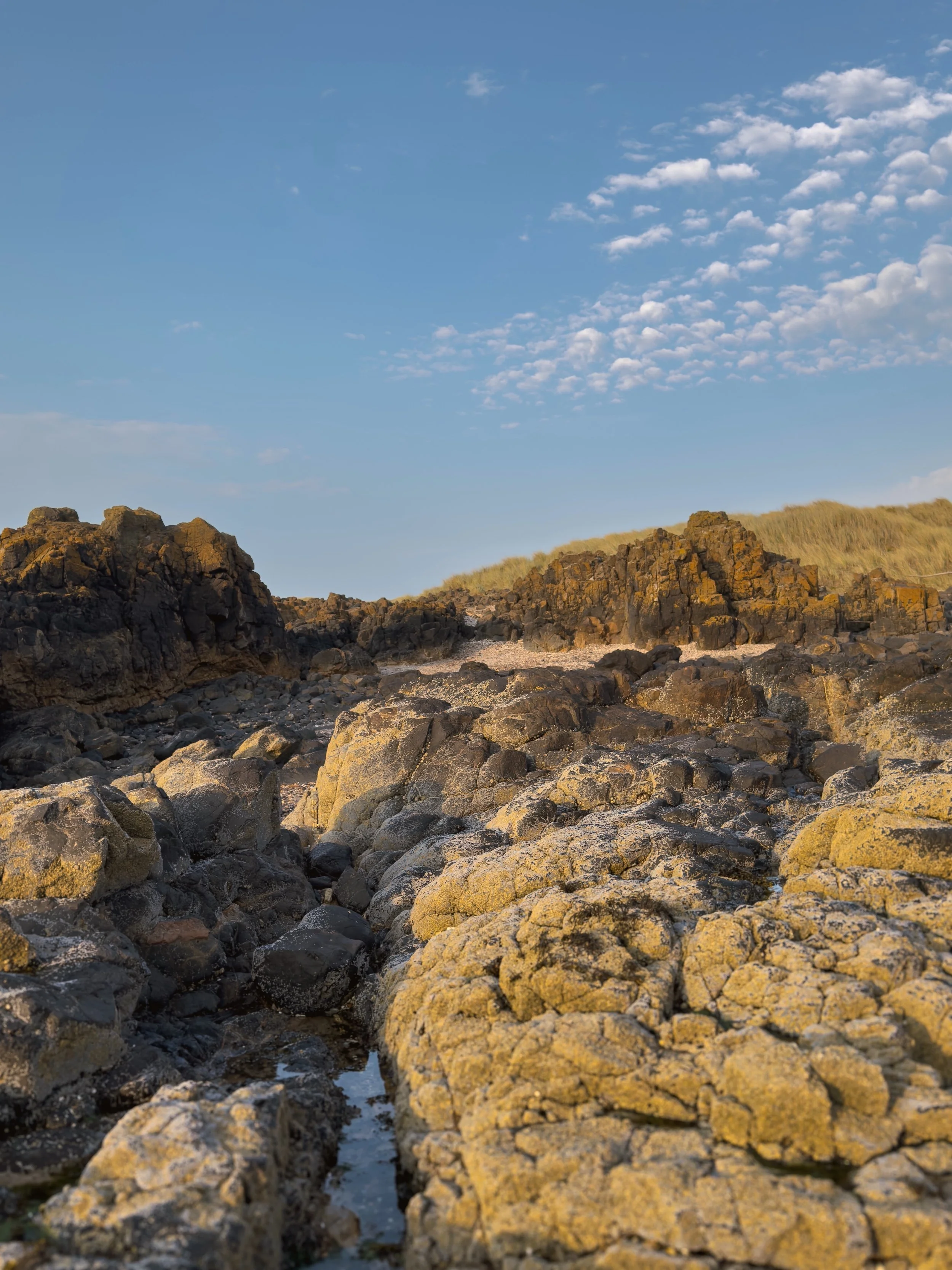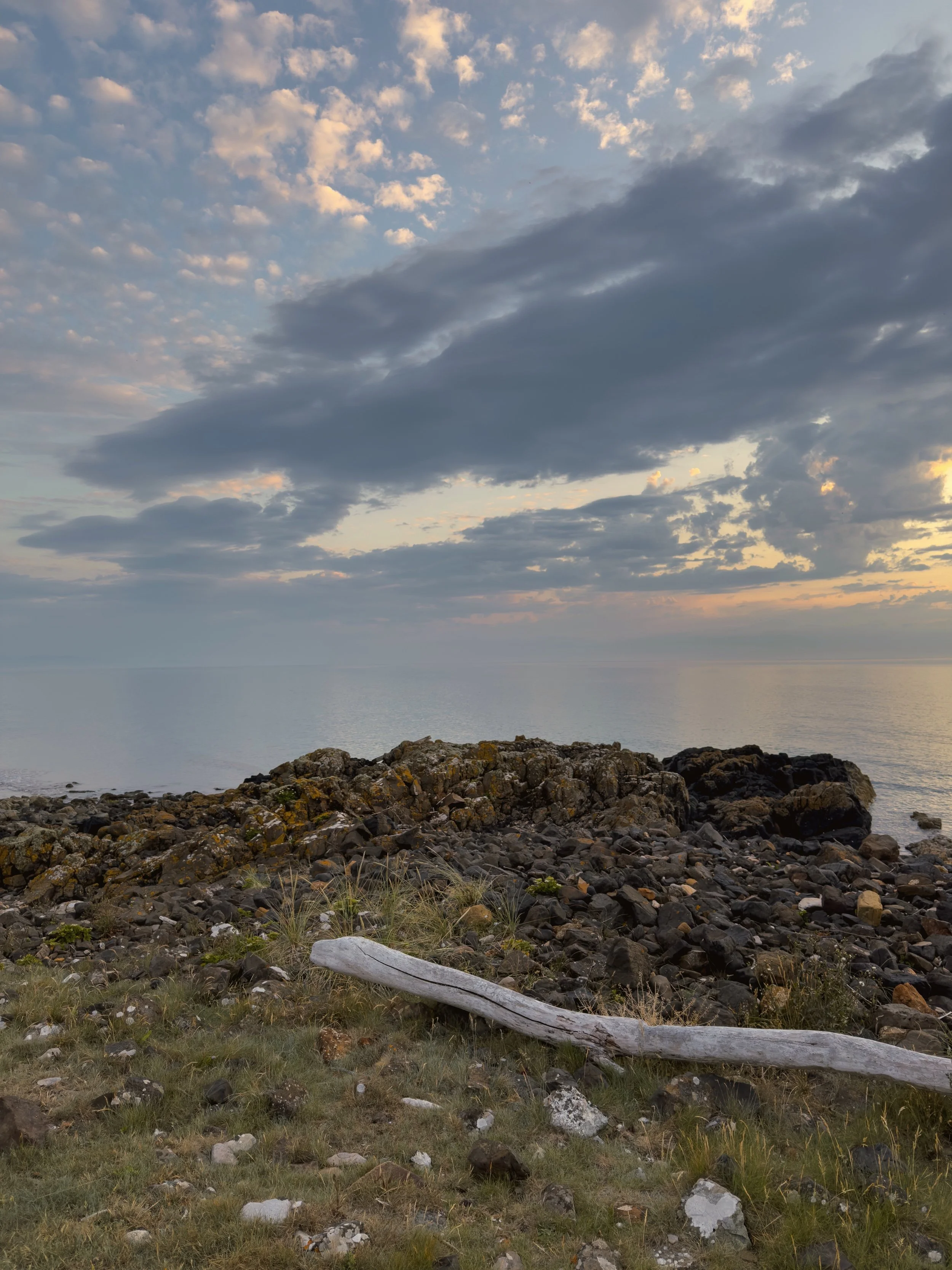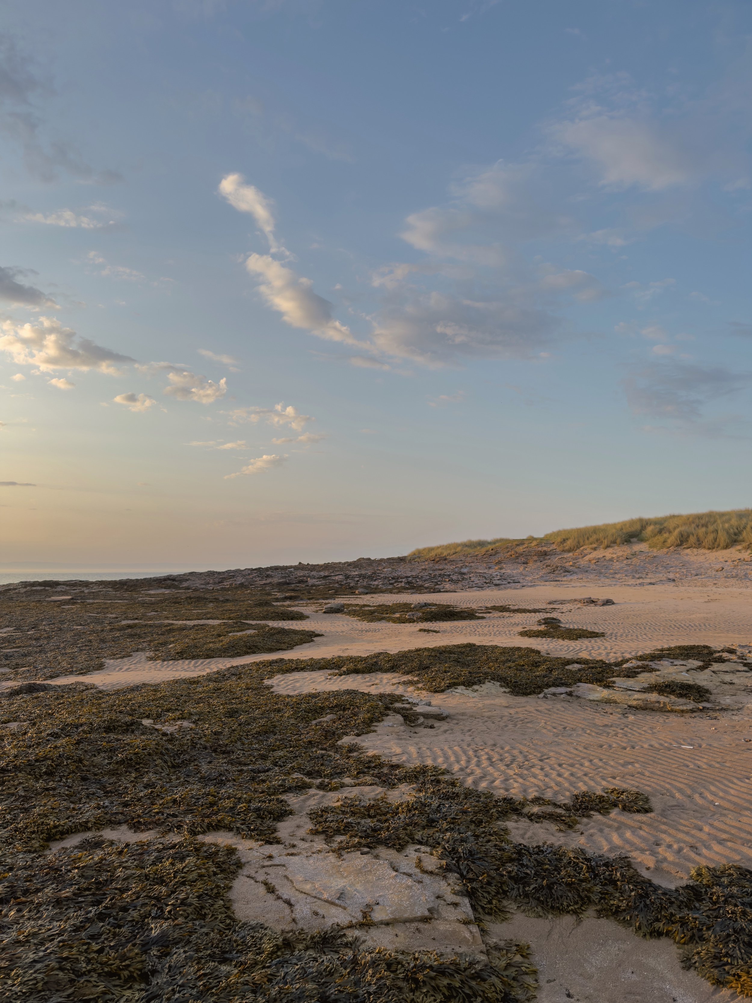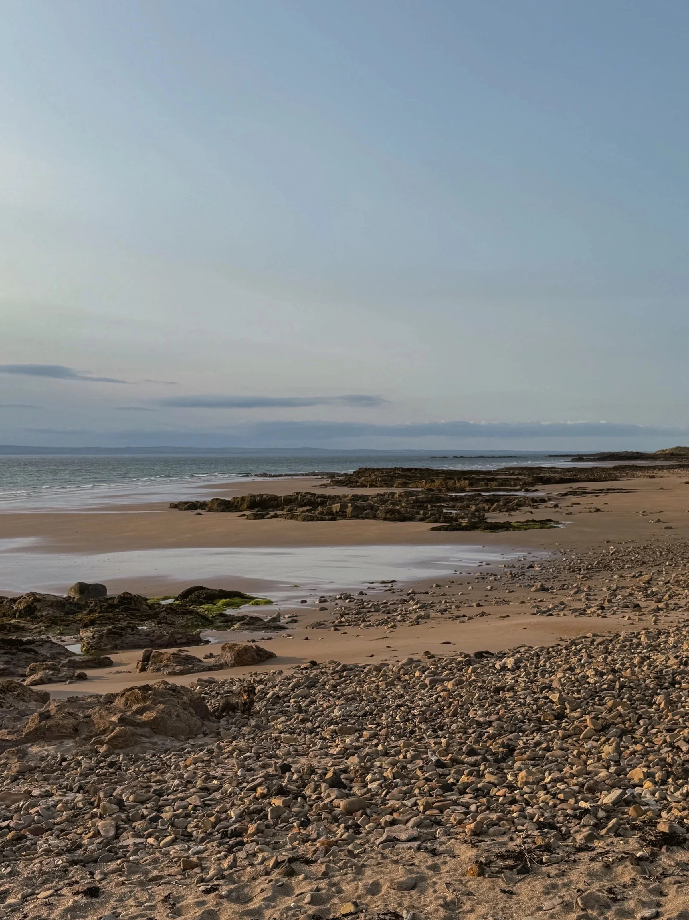 These following photos are from the same route but a week later, on a balmy Saturday evening when we marked the summer equinox with this walk. The light was gorgeous by the time we arrived here (below), to this stretch of beach beyond Gullane, and we walked on along the shore (cue: lots of rock photos in this gentle light) to our usual turning point, where we paused to watch the sun fade over the water. A gentle, unshowy sunset for this longest day of the year, and a moment that feels so far away now, as we edge into November.